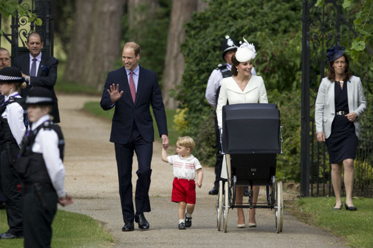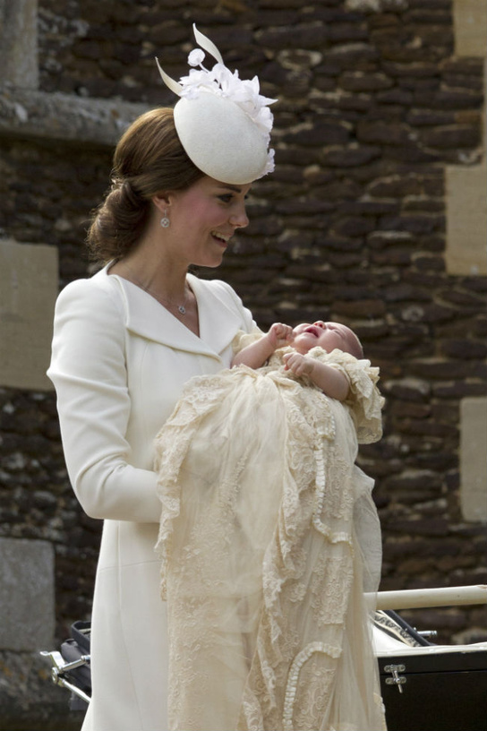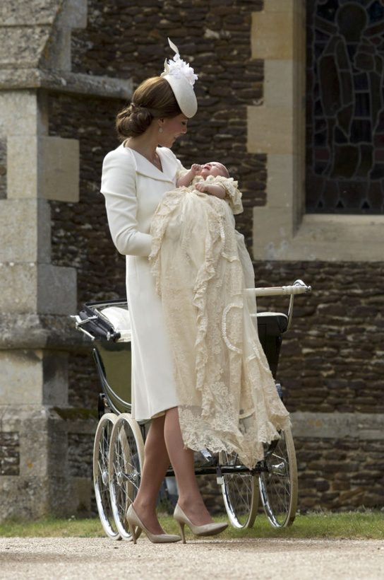 Uno de los momentos más esperados de la ceremonia era, por supuesto, la llegada de Kate Middleton con Charlotte. Lo ha hecho con el Príncipe Guillermo y Jorge a su lado, mientras que ella empujaba un cochecito retro (de la firma Millson, lo utilizó la propia reina con los príncipes Andrés y Eduardo) donde estaba la niña. La Duquesa de Cambridge llevaba un coat-dress con las solapas abiertas y un tocado con flores, ambos en color blanco roto. El vestido es de Alexander McQueen y el tocado de Jane Taylor. Charlotte, por su parte, llevaba el mismo faldón color crema que llevó su hermano hace dos años, una réplica de una pieza que habían llevado casi 90 bebés reales. Esta pieza la ha confeccionado Angela Kelly, la modista de confianza de la Reina desde hace años.