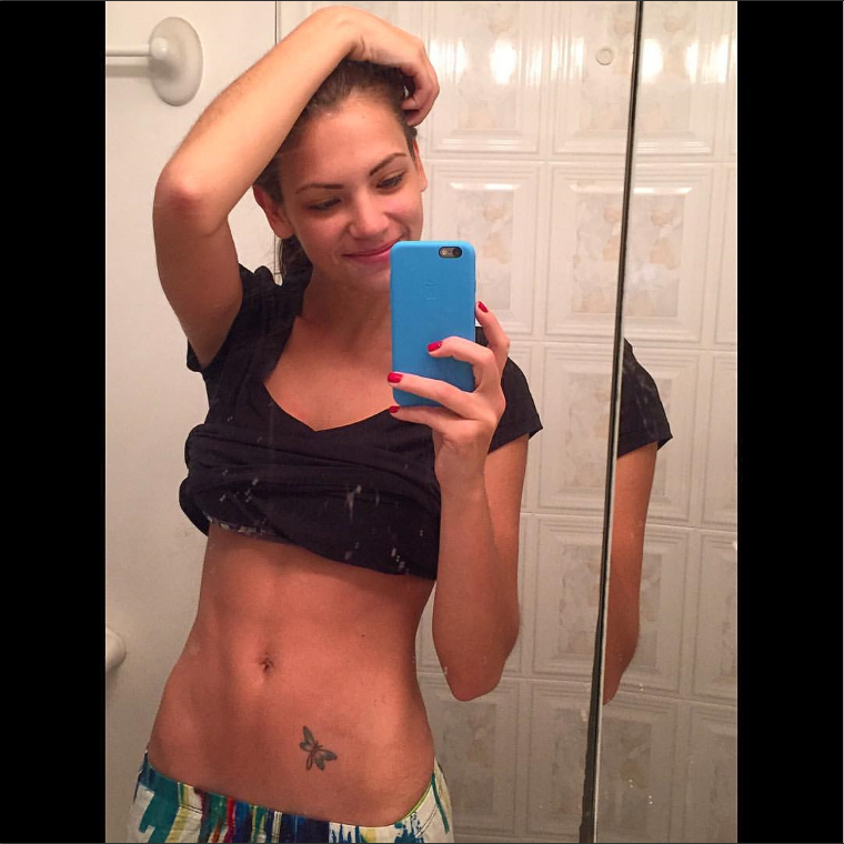 La actriz compartió una foto en sus redes sociales donde muestra cómo va su entrenamiento, en la foto se ve su tonificado abdomen y también deja ver un tatuaje que se encuentra ubicado en la parte baja de su abdomen. Chimaras, hija del fallecido actor Yanis Chimaras, es novia del cantante Gustavo Elis.