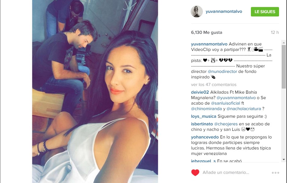 A través de su cuenta personal de Instagram, sin revelar mucho pero a la vez confesando todo, Yuvanna Montalvo anunció que participará en el video de «Se Acabó» del dúo zuliano, SanLuis ft Chino y Nacho, dirigido por Nuno Gómes.