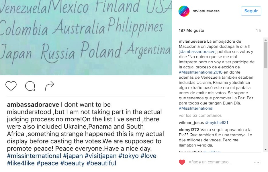 «No quiero que se me mal intérprete pero no voy a ser participe de la actual proceso de elección de #MissInternational2016 en donfe además de Venezuela también estaban incluidas Ucrania, Panamá y Sudáfrica algo extraño pasó este era mi pantalla antes de emitir mis votos. Se supone que tenemos que promover La Paz. Paz para todos que tengan Buen Día.#MissInternational«, agregó junto a la foto donde aparece el nombre de Venezuela en la lista y otras candidatas que no fueron seleccionadas.