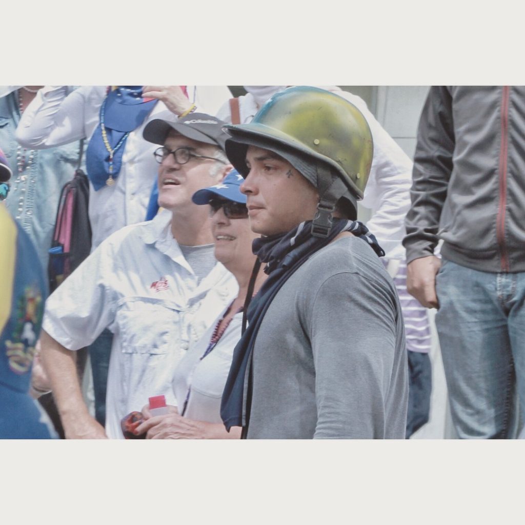 Sin hacer alarde en las redes sociales, con un casco de Venezuela, un suéter, y apoyando a los jóvenes que buscan la libertad del país, se presentó el interprete de «Ojitos«.
