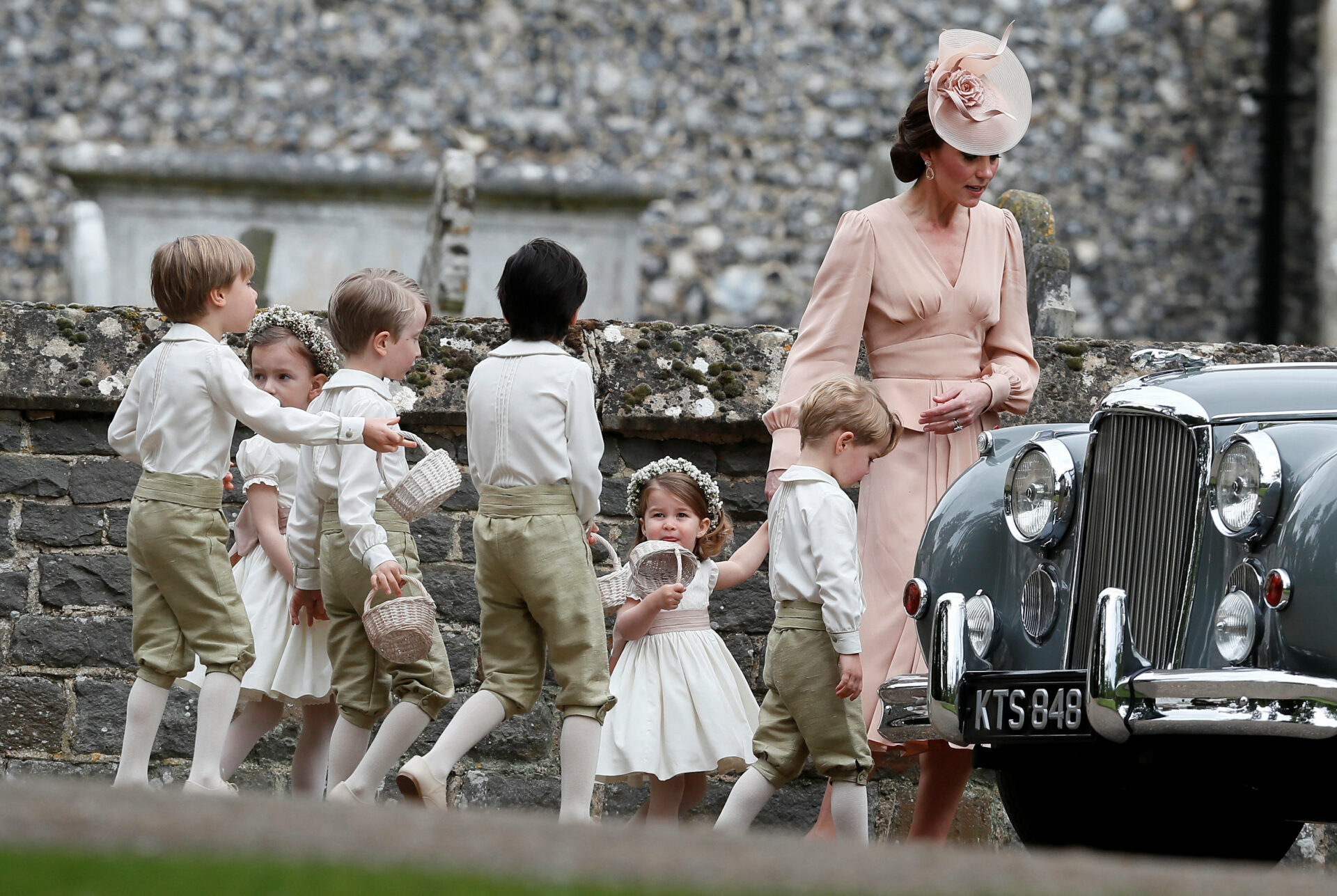 Centenares de curiosos se entremezclaron este sábado con los profesionales de los medios (locales e internacionales) en los aledaños de la iglesia para asistir al desfile del centenar de invitados que acudieron al enlace, entre ellos el tenista Roger Federer y su esposa Mirka. El príncipe Enrique compareció junto a su hermano Guillermo –aunque la rumorología apuntaba a la presencia de su pareja, Megan Markle, en el festejo posterior-, mientras la madre de la novia, Carole, lo hizo del brazo de su hijo menor, James, y ataviada con un traje rosa pálido. Ese fue también el tono del vestido de seda elegido por la duquesa de Cambridge, pendiente en todo momento de los pequeños Jorge (3 años) y Carlota (2, recién cumplidos).