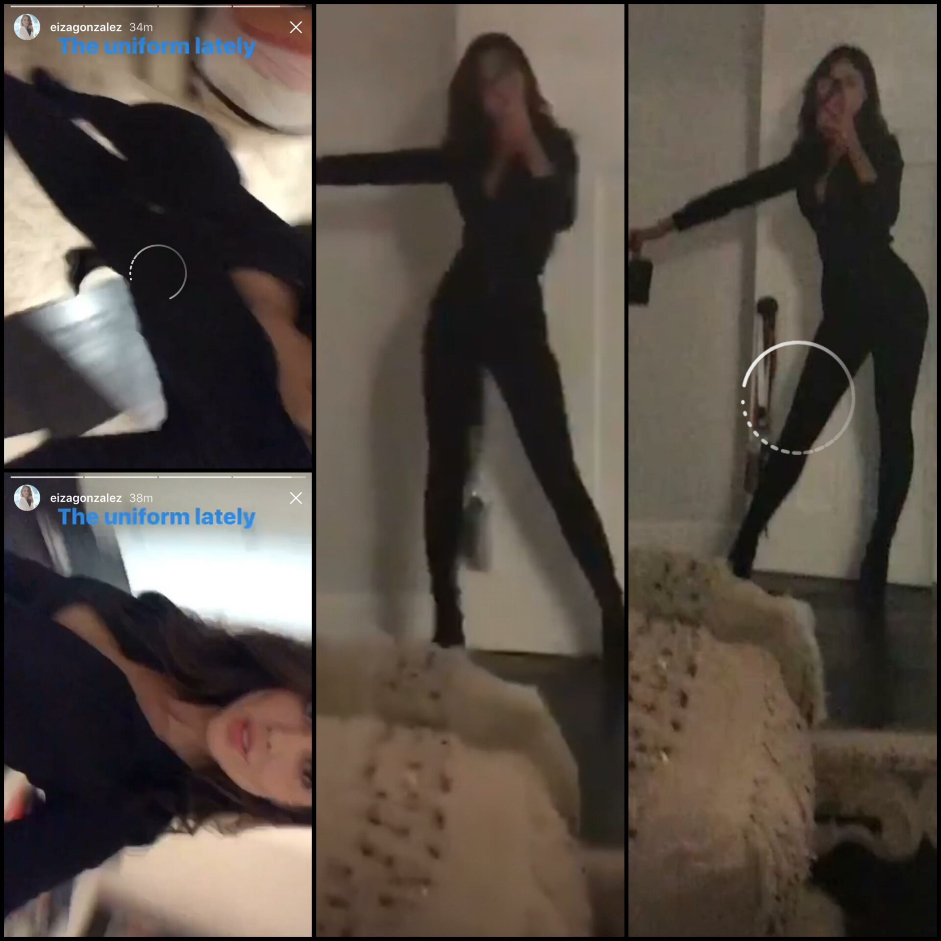 La actriz Eiza González causó revuelo con una foto muy reveladora que compartió en Instagram Stories, con la descripción “Mi uniforme últimamente” en el que se le ve un ajustado traje negro de piel y botas altas.