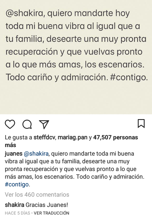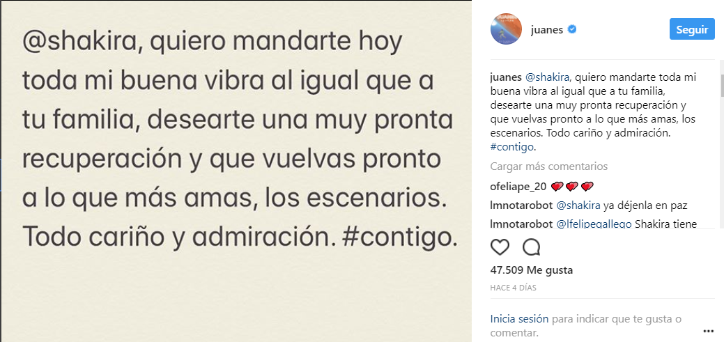 “Shakira, quiero mandarte hoy toda mi buena vibra al igual que a tu familia, desearte una muy pronta recuperación y que vuelvas pronto a lo que más amas, los escenarios. Todo cariño y admiración”, escribió el intérprete de “La camisa negra”, “Volverte a ver” y “Nada valgo sin tu amor” en el pie de la imagen que divulgó hace unos días en su cuenta de Instagram.
