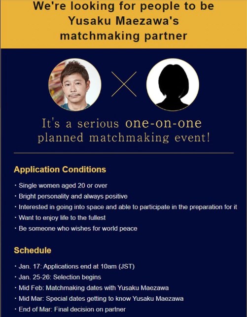 En el comunicado, Maezawa dice que está buscando una mujer para formar una pareja estable. Busca una mujer que tenga una personalidad positiva, que esté interesada en que se logre la paz mundial y que esté dispuesta a prepararse para ir al espacio y emprender esta odisea alrededor de la Luna.