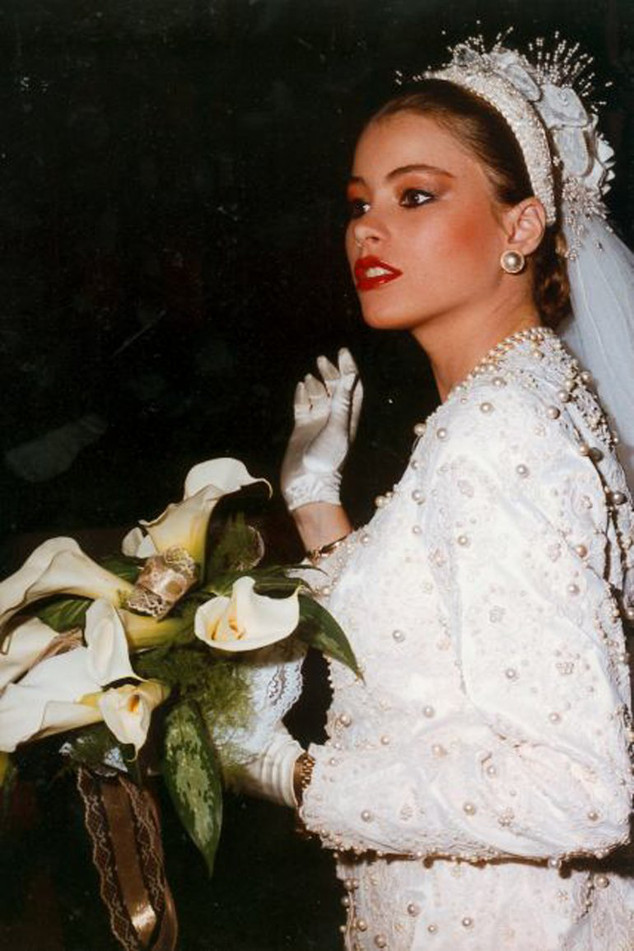 Un vestido de novia con mangas largas y perlas bordadas fue la elección de Vergara, que acompañó con guantes, el pelo recogido y mucho maquillaje, como se acostumbraba en la época.