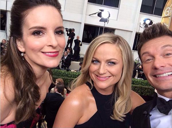 Ryan Seacrest junto a Tina Fey y Amy Poehler.