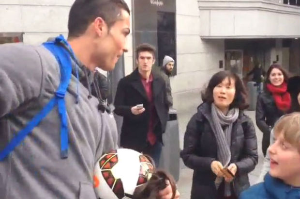 El joven fan de Ronaldo paseaba por la Plaza Callao de Madrid cuando su ídolo se despojó de su caracterización – con bigote y peluca – para abrazar al niño que no entendía lo que estaba sucediendo.