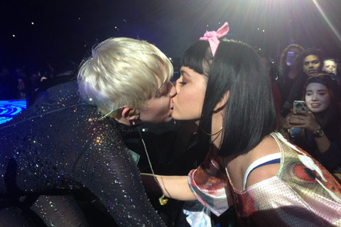 Un concierto de Miley, Katy entre el público, la primera se acerca a la segunda, se funden en un beso. Este gesto no estuvo exento de polémica entre las dos estrellas ya que, al parecer, a Perry no le hizo tanta gracia. El caso es que todo quedó en anécdota y hoy son grandes amigas. Realidad: nada de relación, solamente típico momento provocador que dio mucho que hablar.