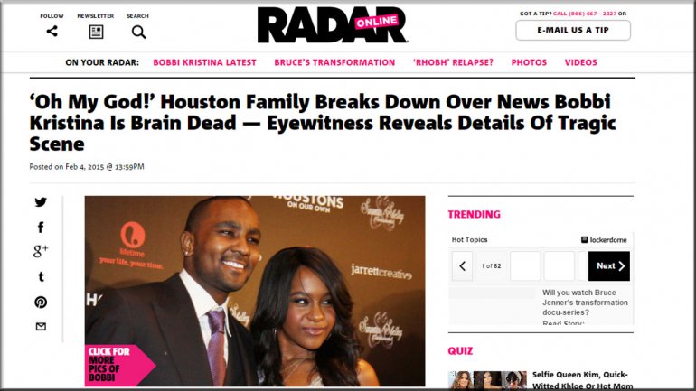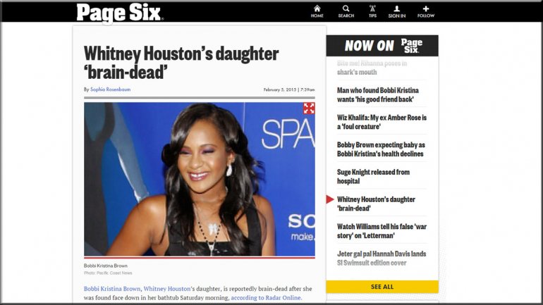[dropcap]B[/dropcap]obbi Kristina Brown, la única hija de la fallecida cantante Whitney Houston, tiene muerte cerebral, según confirmó el sitio de espectáculos Page Six, del reconocido diario The New York Post. Una fuente cercana a la familia reveló al citado medio que su padre, el cantante Bobby Brown, está en shock por la triste noticia.