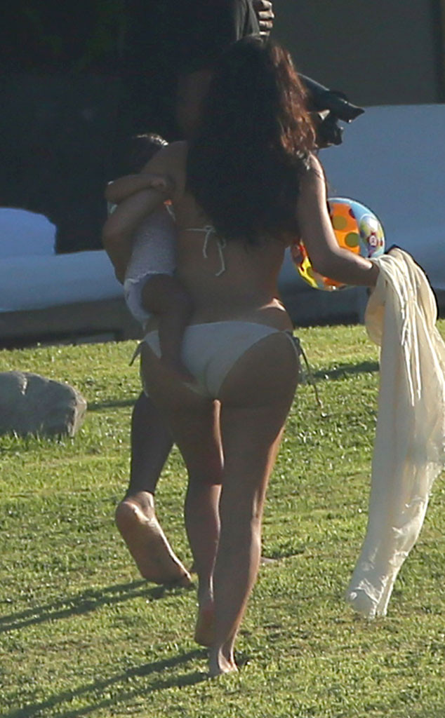 Y mientras Kim figuró en los titulares de prensa en un traje de baño blanco para mostrar su silueta post bebé en Instagram, lució un bikini diminuto en su viaje familiar.