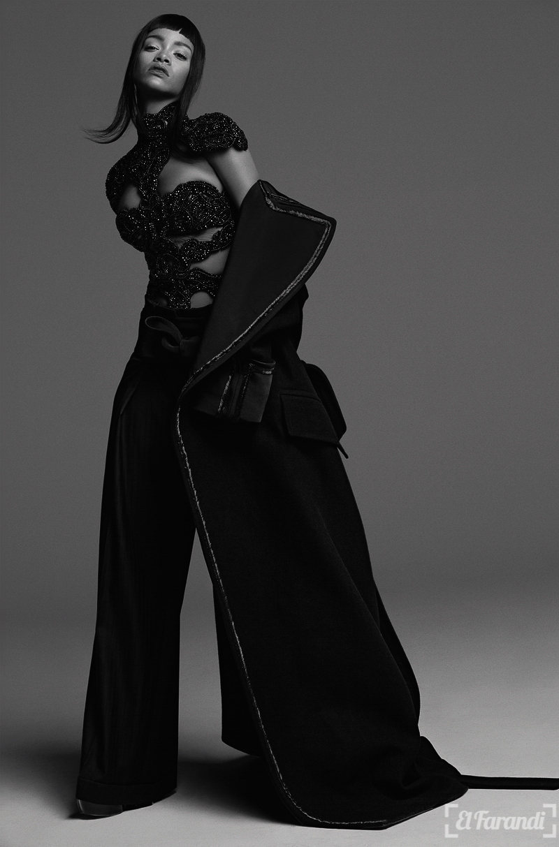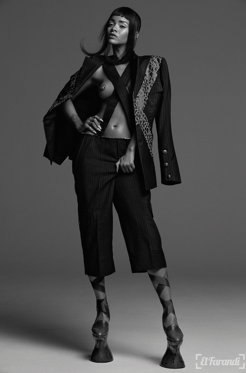 En las fotos en blanco y negro Rihanna luce algunas de las prendas del diseñador.