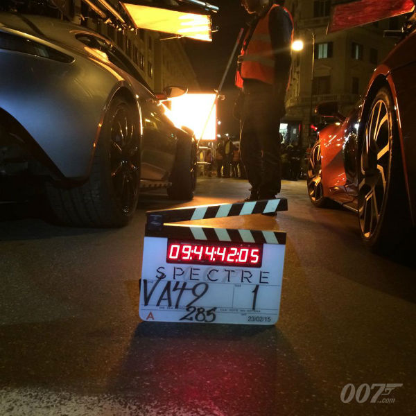 En la imagen se puede ver la claqueta de la película en medio de dos coches. El de la izquierda es un modelo Aston Martin DB10 y el de la derecha unJaguar CX75. Los rumores afirman que el primero será propiedad de James Bond y el segundo del villano al que tendrá que enfrentarse. Según algunos de los presentes durante el rodaje, estos coches aparecerán en la escena que te detallamos anteriormente.