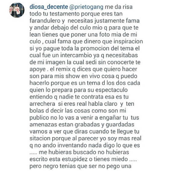 A mi no me importa que me digan puta eso no es ofensa. Y a mis espaldas cuando necesito de mi imagen. A parte ofrecerme plomo @PrietoGang — Diosa Canales (@canalesdiosa) febrero 26, 2015