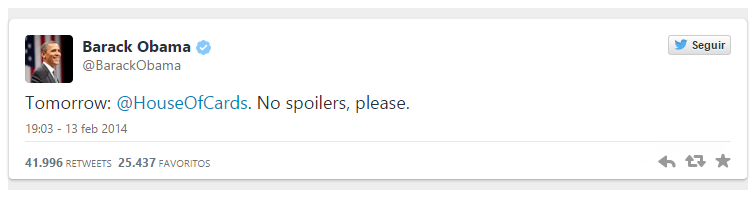 Gran admirador de la serie, el año pasado incluso pidió desde su cuenta de Twitter que nadie le adelantara la nueva temporada del programa: «Mañana, House of Cards. Sin spoilers, por favor».