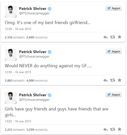 El lunes US Weekly explicaba que se había visto a Schwarzenegger Jr. en un bar, abrazado a una joven morena enfundada en un minúsculo bikini negro. Él la tomaba por la cintura mientras que ella le rodeaba el cuello con los brazos. Más tarde, se le vio fotografiándola. En la era de la información, Twitter es la herramienta más veloz así que, tan pronto como él oyó hablar de los rumores, intentó justificarse a través de la red social… con tres twits.