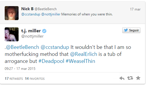 [dropcap]L[/dropcap]a producción de Deadpool acaba de comenzar, pero aún hay muchos detalles del proyecto que seguimos sin conocer, entre ellos, el personaje que interpretan algunos actores del reparto. Los últimos rumores apuntan a que T.J. Miller podría dar vida a Comadreja (Weasel) en la nueva película de 20th Century Fox, pero no hay nada confirmado. La alarma saltó después de que Miller publicase un comentario en Twitter usando los hashtags #Deadpool y #WeaselThin.