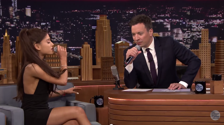 Previamente a este momento único en el show de Fallon, Ariana fue partícipe del sketch Ew!, en el cual también mostró los dotes de su voz, al hacer un solo en competencia con su «sexy amiga», con quien incluso se tomó una selfie para que quedase en la posteridad.