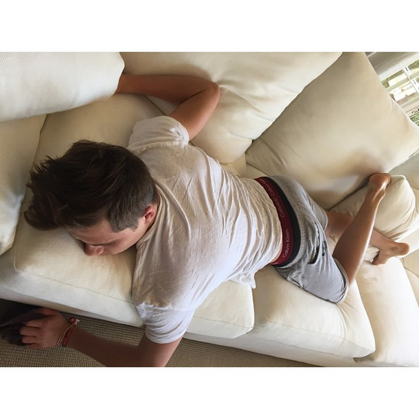 La imagen es devastadora… Ese brazo colgando del sofá, ¡nos trae recuerdos de algunas mañanas que es mejor olvidar! Sin embargo, esa estrecha cintura y su espalda bien formada (por no hablar de las pompis) dan cuenta de un físico prometedor. ¡A más de una se le hace agua la boca!