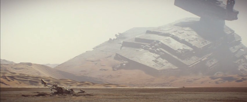 El personaje que interpreta Ridley, una enigmática mujer llamada Rey, se dedica a desenterrar tecnología para repararla y venderla. Trabajo en ese planeta no le va a faltar. En primer plano se pueden ver los restos de un X-Wing, y al fondo todo un Destructor Imperial. Un speeder recorre el paisaje a toda velocidad. Por su aspecto parece el mismo que el que pilota Rey en el teaser.