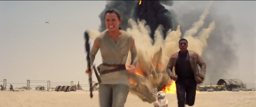 Tras el corte, Rey y un Finn que ya no lleva el traje de Stormtrooper huyen de lo que parece un ataque aéreo imperial sobre Jakku. El responsable aparece a continuación. Presentamos al sith Kylo Ren en todo su esplendor.