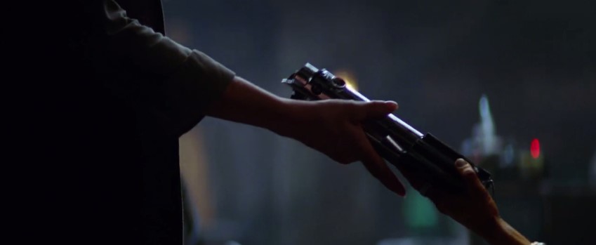 La siguiente escena nos muestra un sable láser cambiando de manos. Ya había una referencia a ese sable en forma de sonido al final del teaser revelado hace unos meses atrás. Es el arma original de Anakin Skywalker antes de que se convirtiera en Darth Vader. «Un arma noble para tiempos más civilizados», como la definió Ben Kenobi cuando se la entregó a Luke Skywalker en el «Episodio IV».