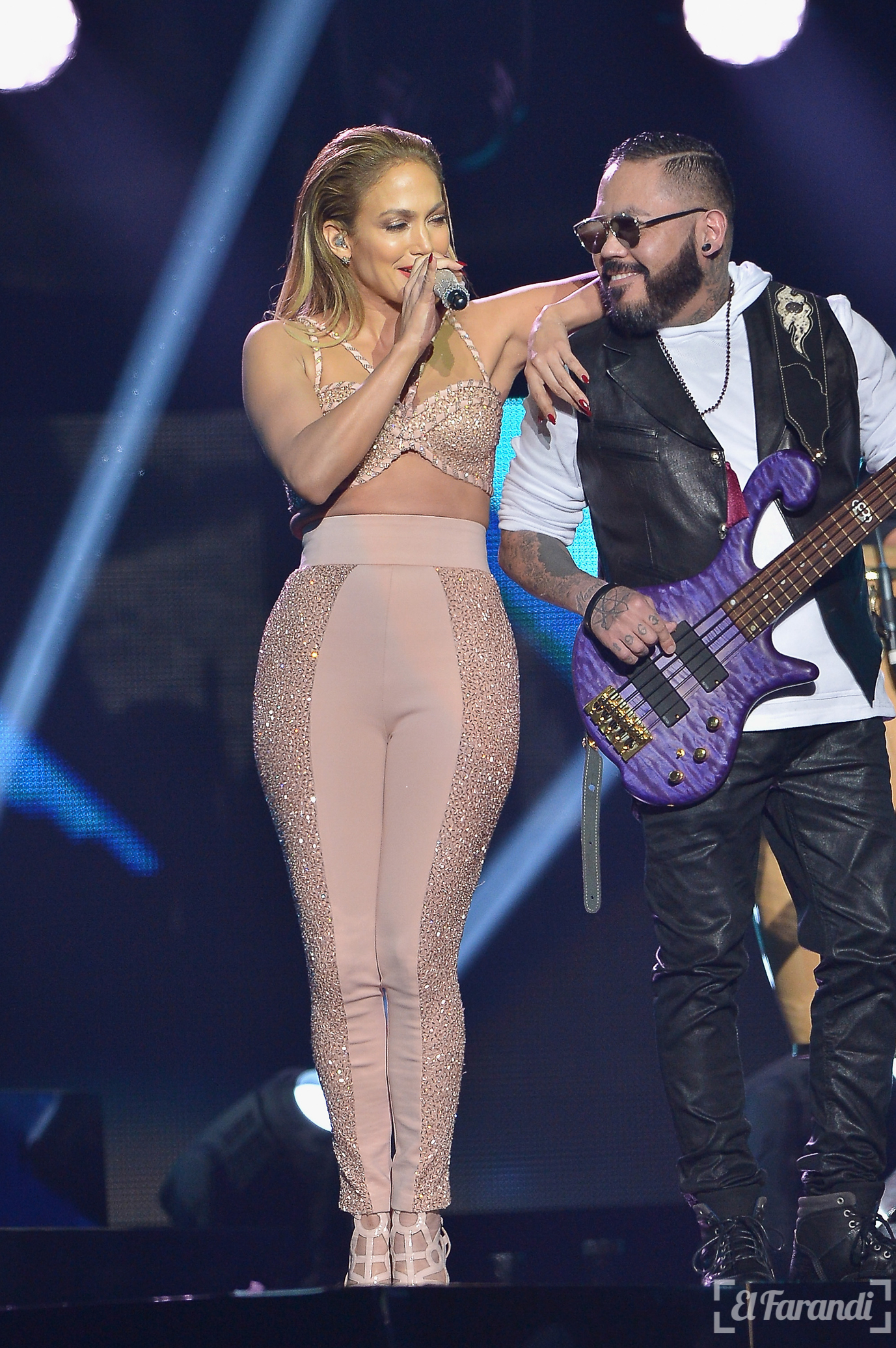 Con un montaje de fotografías de Selena como fondo, Jennifer Lopez se apoderó del escenario ataviada con un conjunto que de falda se transformó en pantalón y un bustier en palo rosa con predería, el cual, además de resaltar la silueta de la también actriz, recordó los vestuarios utilizados por Selena.