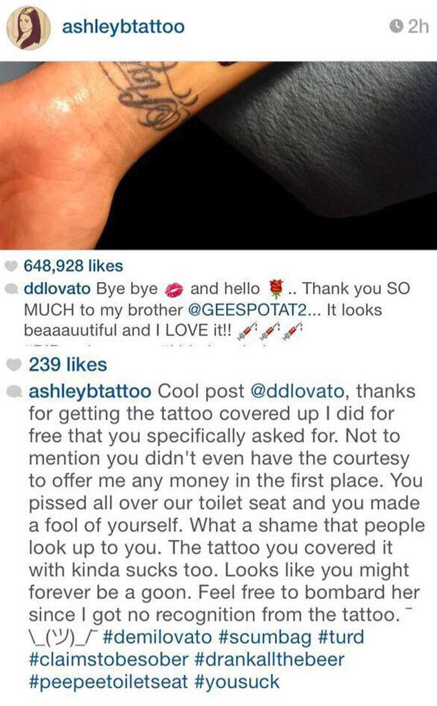 Esto no le pareció al autor el primer tatuaje, Ashley McMullen, que asegura que Demi estaba ebria cuando fue a hacérselo: “Buena foto, Demi, gracias por taparte el tatuaje que te hice gratis porque tú lo pediste…”, dijo la tatuadora. “Ni mencionar que no tuviste ni la decencia de ofrecerme algún pago por mim trabajo. Orinaste todo el baño ese día y nunca te dije nada. El tatuaje con el que te cubriste el mío está horrible” Después de todo esto, Demi contestó: “Querido Ashley, no me habia dado cuenta de tu comentario hasta que vi los titulares de algunas noticias. En primera, no recuerdo haber sido tatuada por ti, lo lamento, como sabes, estaba drogada y a veces la gente en ese estado no recuerda cosas.