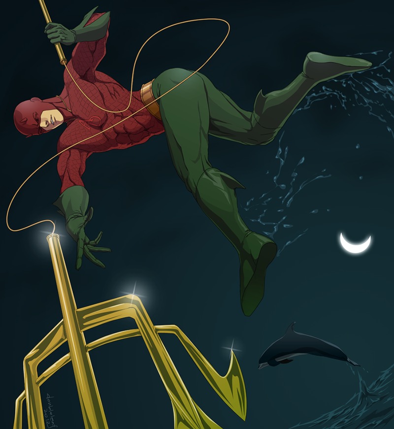 Daredevil (Marvel) + Aquaman (DC)… No estamos seguros dónde intentaría combatir la inseguridad: ¿en las calles de Nueva York?, ¿en las profundidades del océano?, ¿ambas?. No lo sabemos, pero el diseño quedó bastante llamativo.