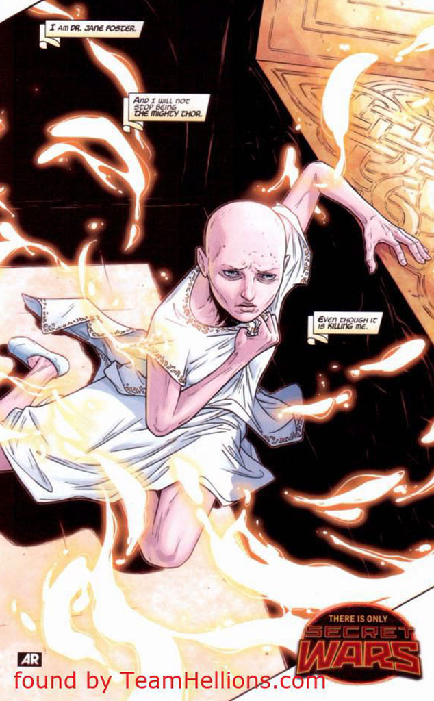La versión femenina de Thor es… Jane Foster (interpretada por Natalie Portman en las películas) también está luchando contra el cáncer en el comic. La antigua novia de Thor ve sus síntomas empeorados al tomar Mjölnir, así que convertirse en un superhéroe está prácticamente acabando con su vida.