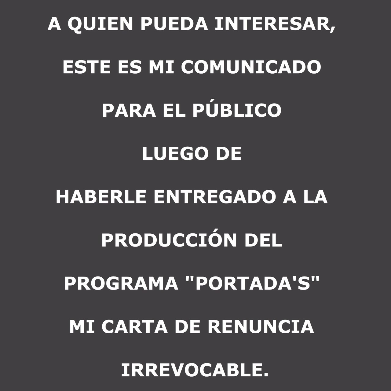 Con este comunicado hago pública mi renuncia al Programa «Portadas» de Venevisión con las razones que son para así evitar malos entendidos.