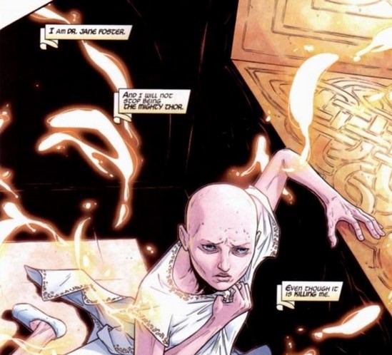En el cómic anterior «Thor: God of Thunder», Jane Foster tenía cáncer e iba a morir, y aunque Thor le ofreció su ayuda mágica ella la rechazó. Parece que Foster cambió de opinión y de alguna forma terminó no solo salvándose de esta temible enfermedad, sino siendo la nueva portadora de Mjolnir.