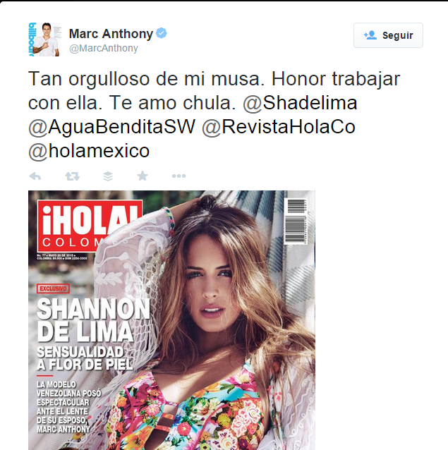 “Tan orgulloso de mi musa… Es un honor trabajar con ella. Te amo, chula”, declaró el intérprete en su cuenta de Twitter, junto a una imagen del reportaje fotográfico que Shannon ha protagonizado para la revista ¡HOLA! Colombia en el que él mismo se ha encargado de sacar las fotografías.