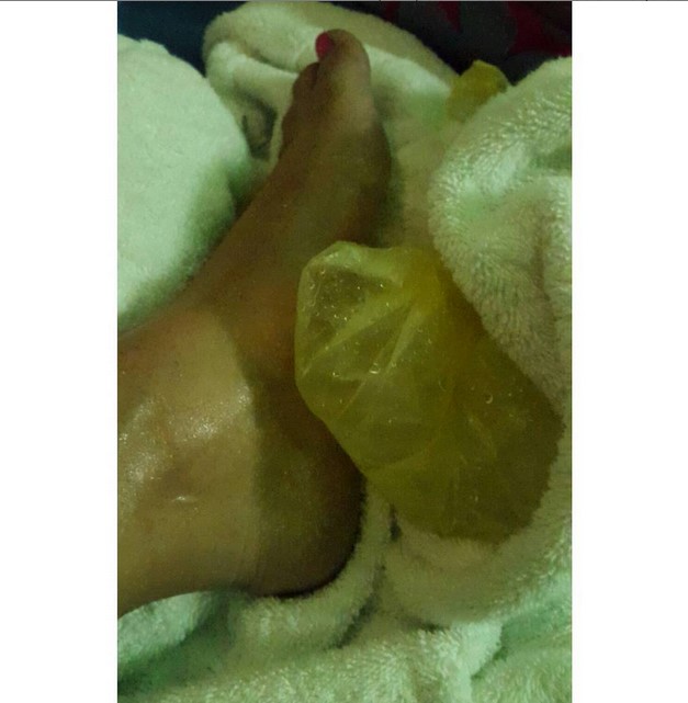 «Buen día para todos … Anoche me doble el tobillo … Asì esta super inflamado … 😢😢😢 de paso que tengo fiebre … No puedo ni apoyar, realmente no se como haré esta noche para cumplir en el #EXPOSEXO …. Pues así sea descalza iré …. Nos veremos esta noche … CARACAS 7PM 👐» acotó en la imagen.