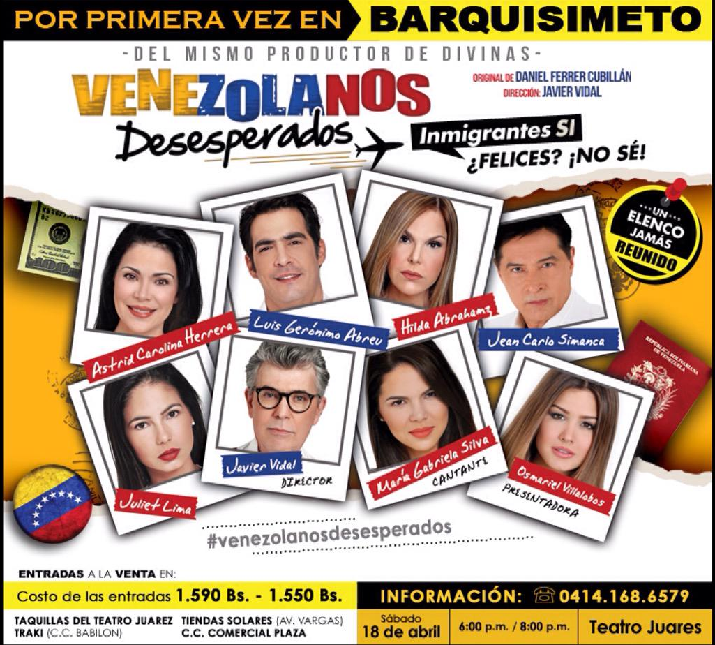 Venezolanos Desesperados, la pieza teatral, se estrenó el 28 de marzo de 2015 con triple función en Maracaibo. Después de tres meses ha visitado la mayoría de las ciudades del país y hasta ahora suma 28 funciones con 28 mil espectadores. Con la próxima función que ofrecerá en el Aula Magna de la URU el próximo 15 de julio a las 9.00 de la noche, completará los 10 mil espectadores solo en la ciudad.