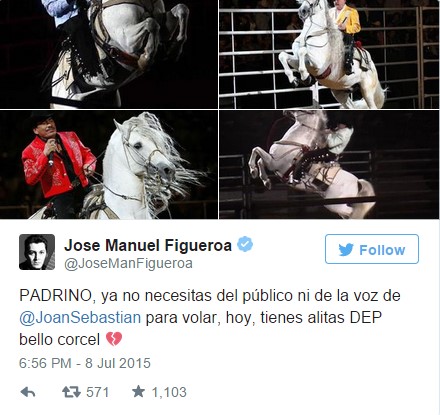 Fue su hijo, José Manuel Figueroa, quien dio a conocer el fallecimiento del corcel a través de su cuenta de Twitter.