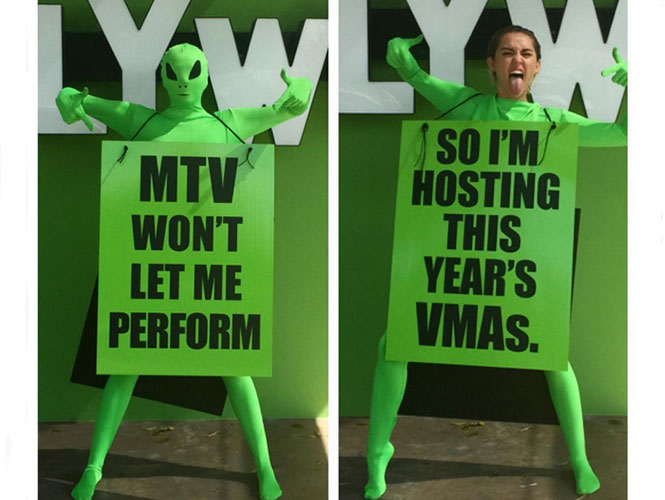 «MTV no me dejará actuar», se puede leer en un cartel que carga junto al disfraz, «así que conduciré los VMAs de este año».
