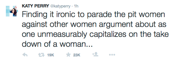 «Encuentro irónico presentar el argumento de poner a las mujeres en contra de otras mujeres cuando una se aprovecha inmensurablemente en la derrota de una mujer….» comenta Katy.
