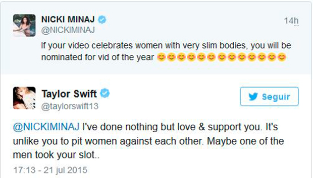«Si tu video muestra a mujeres con cuerpos muy delgados, tú serás nominada para el video del año», fue lo que publicó la intérprete de Anaconda, causando el enojo de Taylor, quien no se quedó callada y respondió: «Yo no he hecho nada más que quererte y apoyarte. No es propio de ti poner a las mujeres en contra. Quizás fue uno de los hombres el que te quitó tu lugar».