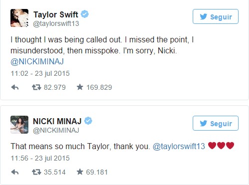 Mientras los cuchillos volaban alguna despistada como Kim Kardashian se metía en la polémica «sin querer» y los fans de las divas mantenía un caluroso debate. Finalmente y para acabar con la discusión que se alargó días, Taylor optó sabiamente por rectificar y pidió diculpas: «Pensé que el mensaje era para mí. Perdí el punto, lo entendí mal y me equivoqué. Lo siento Nicki». A lo que ésta contestó amablemente y dando el asunto por zanjado: «Gracias, significa mucho para mi».
