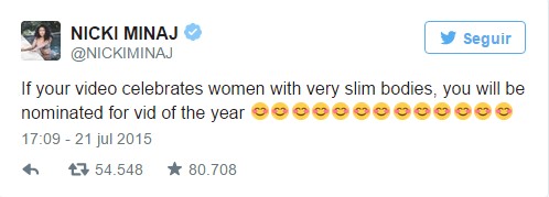 [dropcap]T[/dropcap]odo empezó con las nominaciones a los MTV Video Music Awards reveladas esta semana cuando, en la categoría Mejor vídeo del año, artistas como Rihanna o Nicki Minaj brillaron por su ausencia. Hablamos de B**** Better Have My Money! el clip más polémico del año que rompió internet y de Anaconda, la coreografía que confirmó la derrière como tendencia mundial. Normal que la artífice de este último, la rapera Nicki Minaj criticara públicamente que su video solo se mencionara en categorías inferiores: «si tu vídeo celebra las mujeres muy flacas estará nominado».