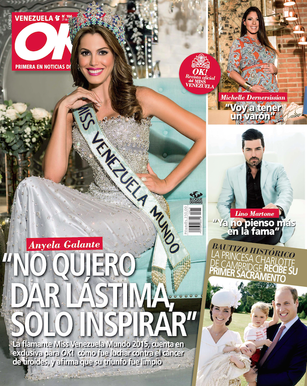 Como ya es costumbre, la reina de belleza salió en la portada de la más reciente edición de la revista OK! Venezuela, donde contó todo, en exclusiva, acerca de su triunfo que asegura fue totalmente limpio y lo difícil que fue superar el cáncer de tiroides con el titular: «No quiero dar lastima, sólo inspirar».