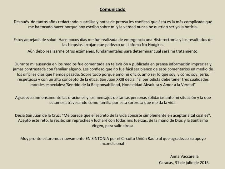 [dropcap]L[/dropcap]a periodista Ana Vaccarella divulgó este viernes un comunicado en el que informó a sus seguidores que padece de Linfoma No Hodgkin, un tipo de cáncer que ataca las células linfáticas y otros tejidos como el bazo o la médula ósea.