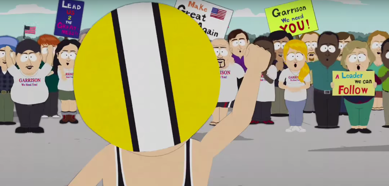 En el segundo episodio de la temporada 19, titulado ¡A dónde se fue mi País” el Sr. Garrison está harto de todos los inmigrantes ilegales en Estados Unidos y quiere construir un muro, uno de los principales temas de campaña de parte del multimillonario Trump.