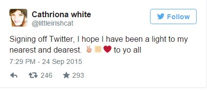 El último tuit de Cathriona fue publicado el 24 de septiembre de 2015, día que aparentemente volvió a terminar su relación con el actor.