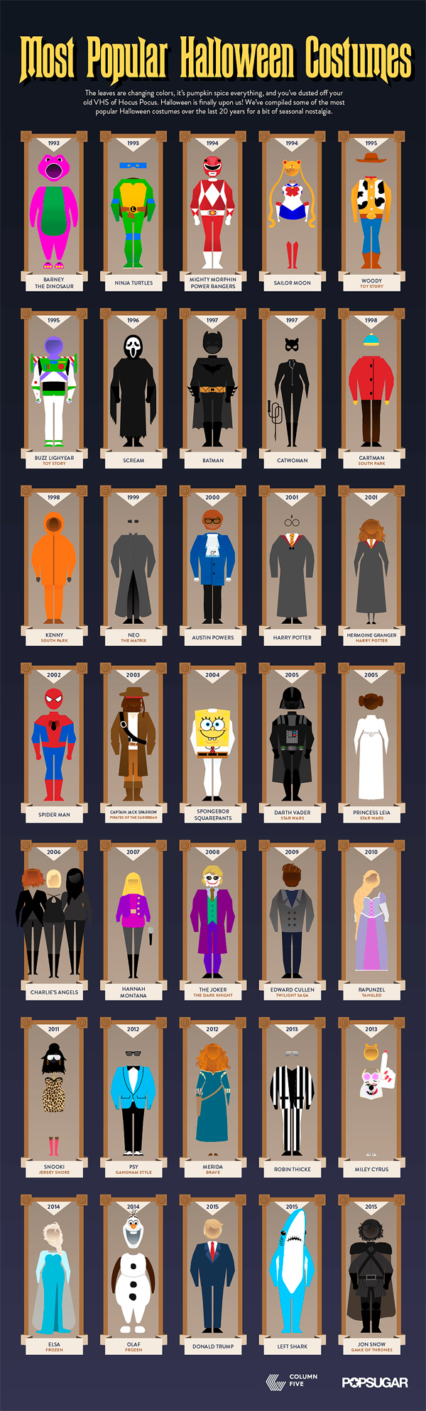 [dropcap]E[/dropcap]l 31 de octubre se acerca y, por si no has pensado en qué disfraz te pondrás para Halloween, los chicos de Pop Sugar han reunido en una sola infografía los más utilizados, año por año, durante los últimos 22.