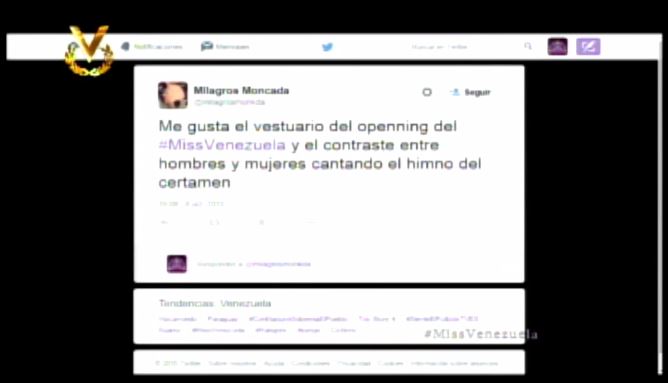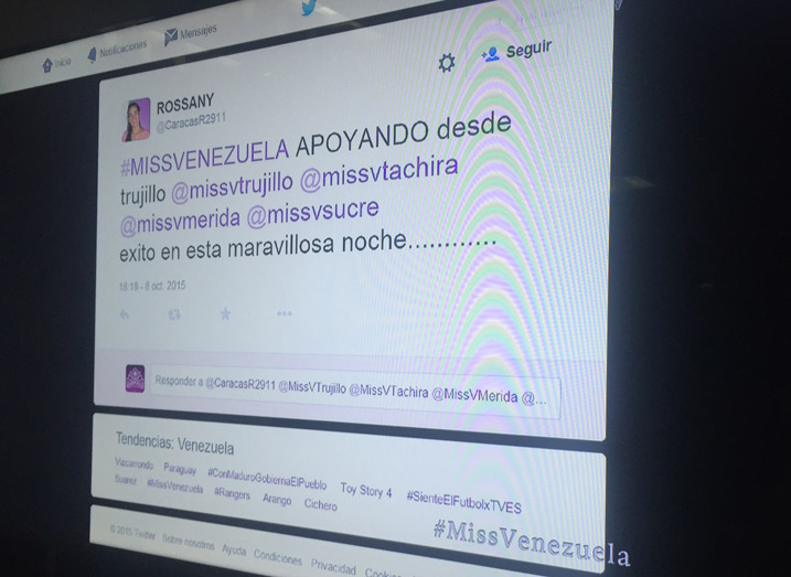 7.- La pantalla “del Twitter”. Una computadora conectada directamente a la página de @MissVzla. Sin un poquito de producción ni nada. Tan burda que en algún momento se abrió el menú de Windows. Y señores del Miss Venezuela, ¿vieron que los Trending Topics eran sobre la Vinotinto, Maduro y Diosdado además de ustedes?