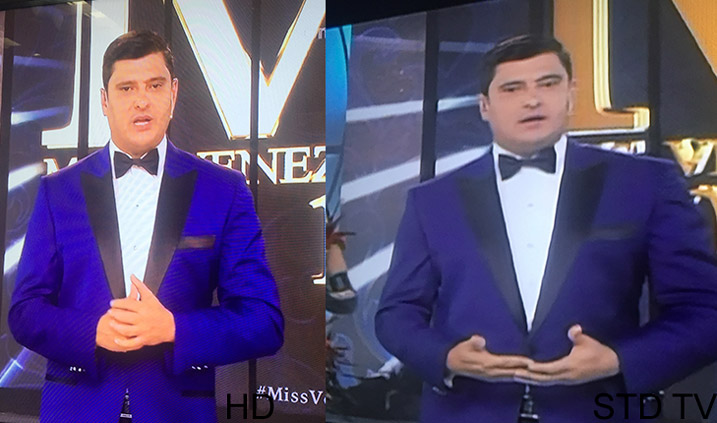 2.- Por primera vez en seis años, el que escribe estas líneas no lo hace desde el sitio del Miss Venezuela, sino desde una redacción. Por eso nunca había podido apreciar la IMPRESIONANTE diferencia entre la transmisión en HD (DirecTV) y la de Standard Definition TV (Venevisión). Si ya el presupuesto lo hace ver un show gastado, verlo en StdTV lo hace ver peor. Un ejemplo: