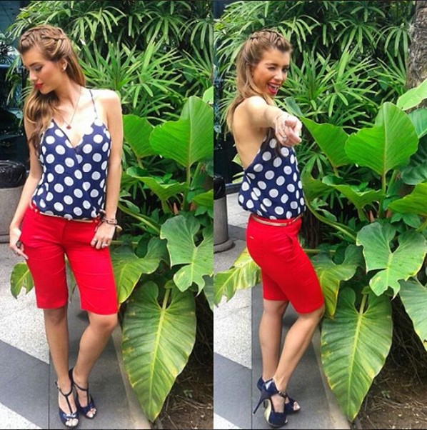 En el jardín de Televen, Andreina Castro lleva un blusa azul con puntos blancos, un short rojo y unos tacones en azul, de Studio F Caracas.
