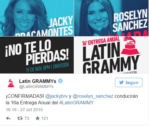 [dropcap]A[/dropcap] pocas semanas para que la 16va edición de los Grammy Latino se lleve a cabo, se anunció que las actrices Roselyn Sánchez y Jacqueline Bracamontes serán las conductores de la ceremonia en el MGM Grand Garden Arena de Las Vegas el 19 de noviembre.